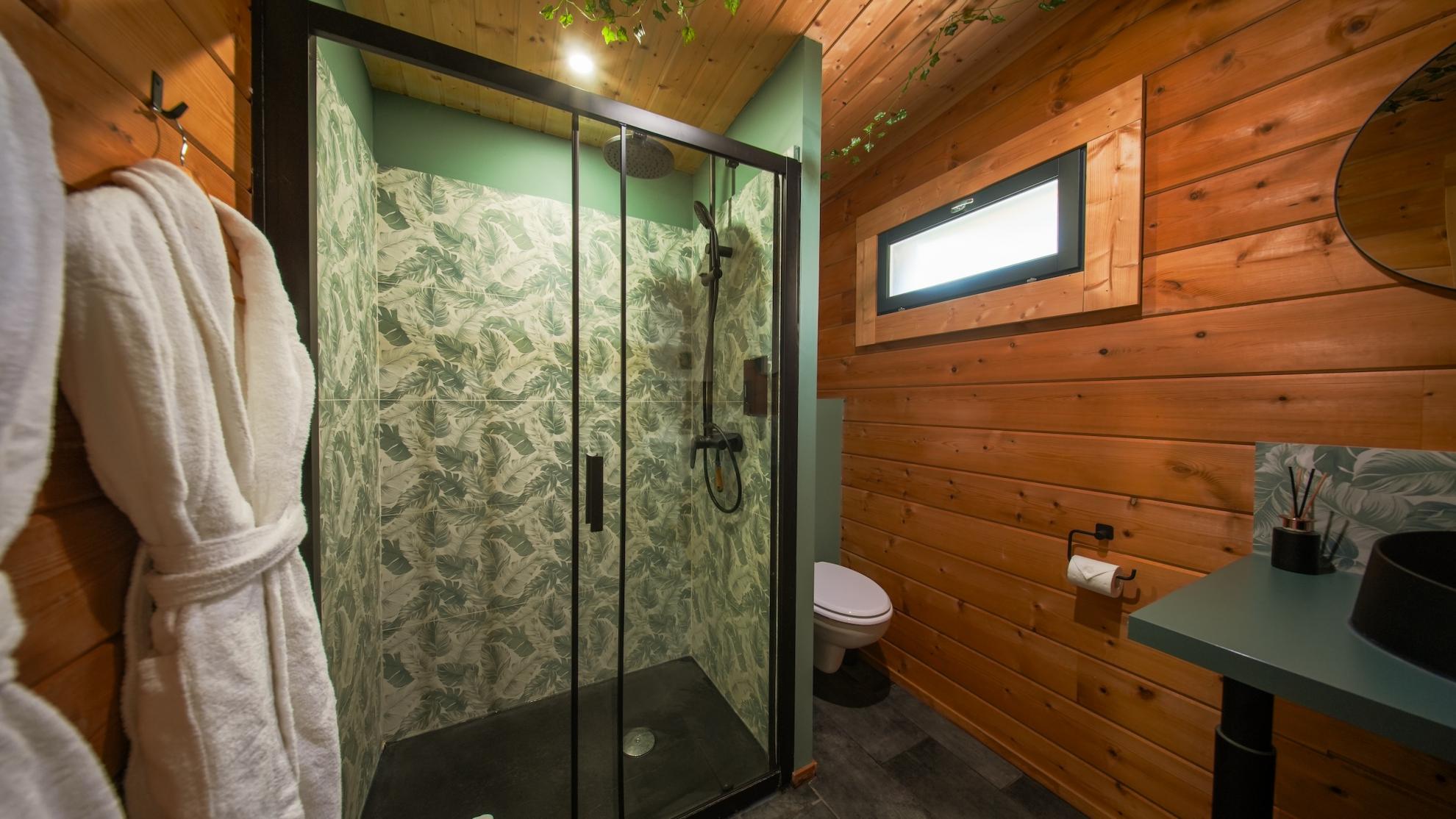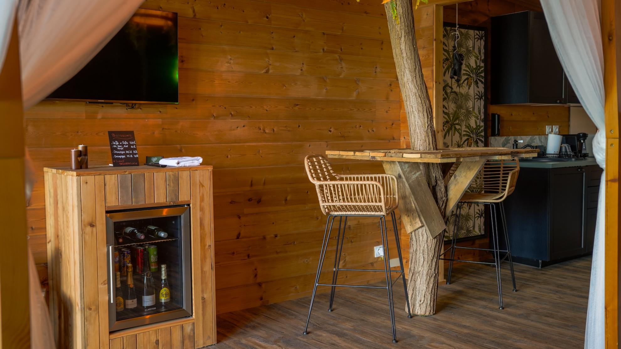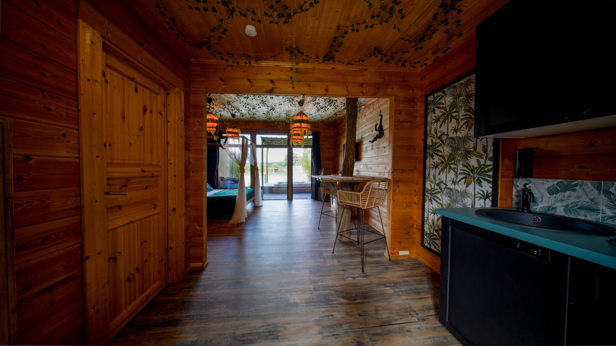 Le Jungle est équipé d’un grand lit double à baldaquin, d'une cuisine entièrement équipée et d’une salle de bain avec douche à l’italienne et WC, d’un mange debout avec deux tabourets confortables.
