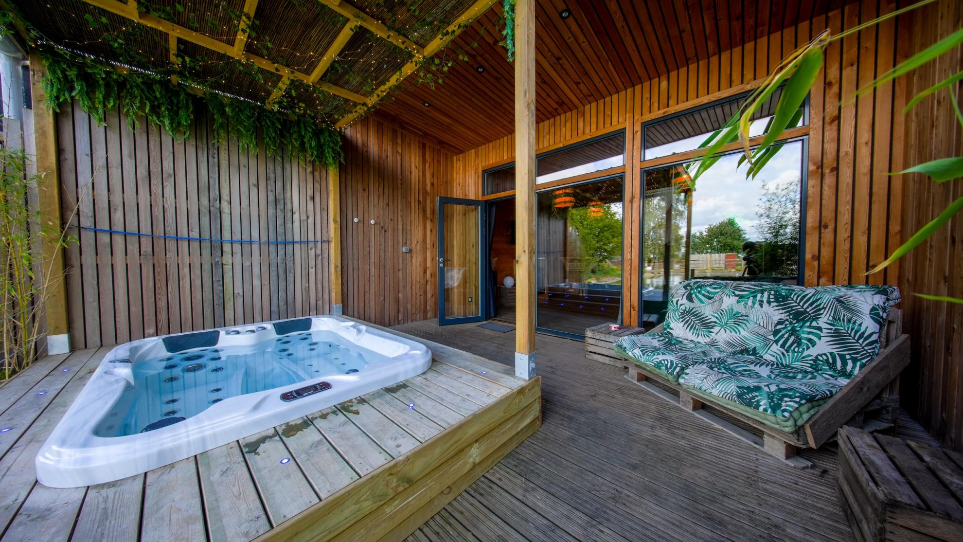 Il est équipé d’un spa extérieur, qui vous permet de vous détendre et de profiter de la vue sur l’étang. Vous apprécierez également le grande terrasse avec coin salon très conforatble