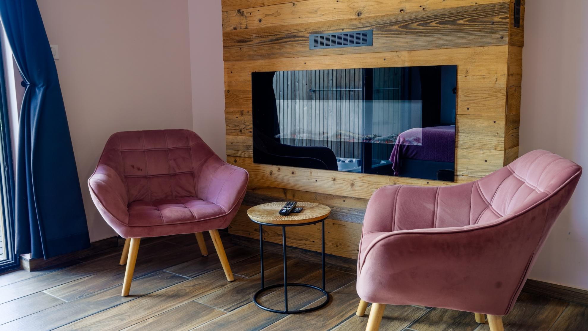 Le Refuge is equipped with a large double bed, a bathroom with a walk-in shower, a separate WC, a fireplace and a cosy lounge area with armchairs and a coffee table.